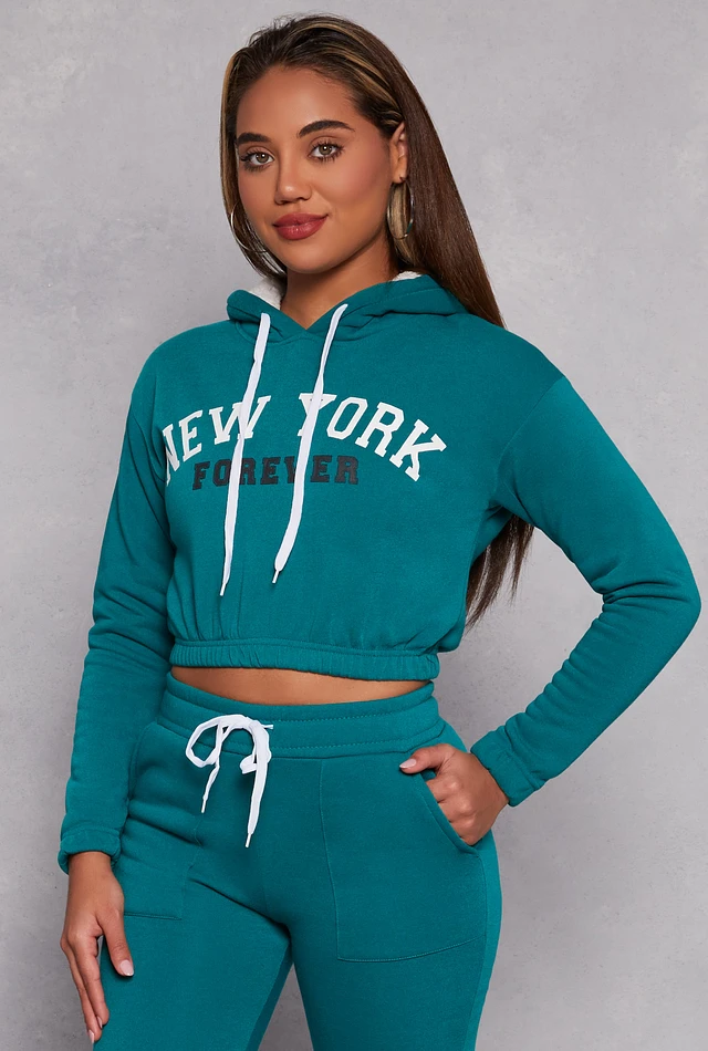 Womens New York Forever Graphic Cropped Hoodie, Blue,