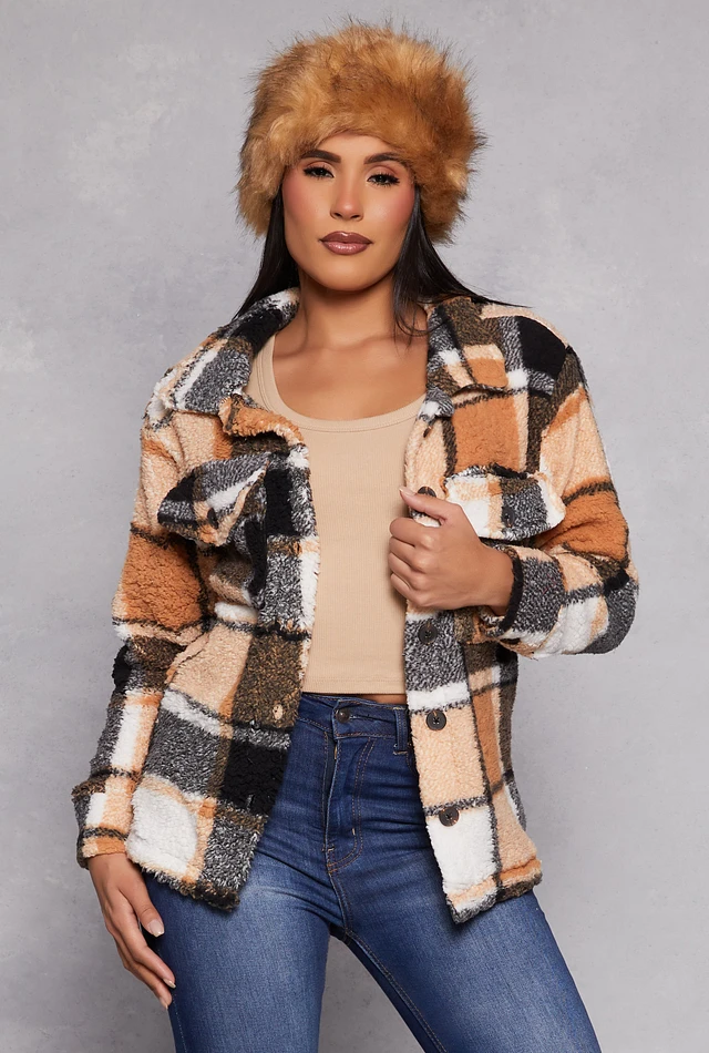 Womens Plaid Sherpa Lined Button Front Shacket, Multi,