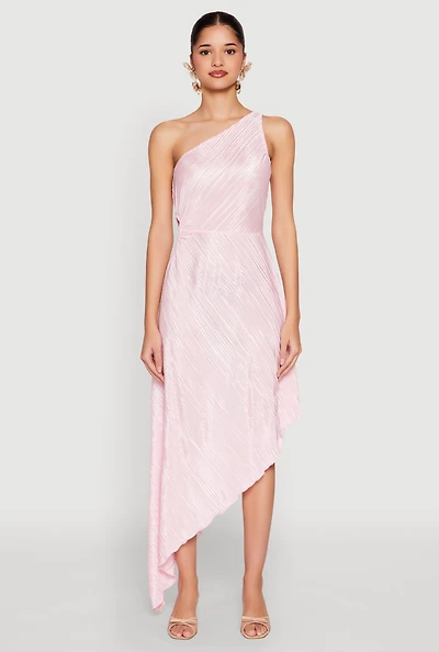 Womens Plisse One Shoulder Asymmetrical Dress, Pink, Size M
