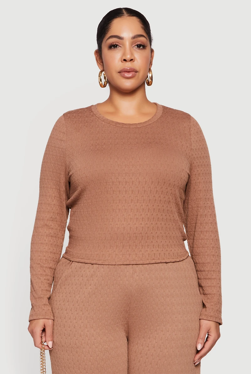 Elevate your everyday look with this plus size long sleeve textured knit tee. Designed with a classic fit and cozy textured knit fabric, it offers both comfort and style for your casual wardrobe. The timeless crew neck and solid color make it a versatile piece that pairs effortlessly with your favorite jeans or skirts. Perfect for layering or wearing solo, this tee is your new go-to for laid-back vibes with a touch of chic. Classic fit for a flattering and timeless silhouette soft textured knit fabric adds subtle dimension and comfort long sleeves and crew neck for all-season wear solid color for easy styling and mix-and-match options made for casual occasions with a relaxed yet polished look model pictured wearing size 1xheight 5 ft 8 in, bust 36 in, waist 35 in, hips 47 infits true to sizecontent and care material: 73% polyester, 25% rayon, 2% spandex care instructions: hand wash country of origin: vietnam rainbow item number 1927058755363