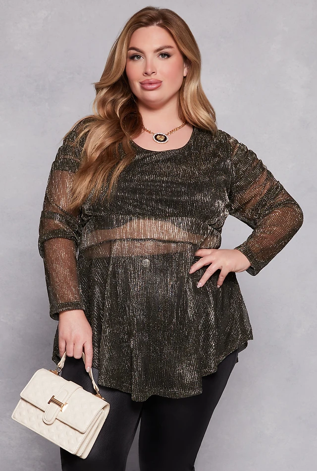 Womens Plus Lurex Plisse Peplum Blouse, Black,