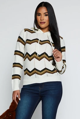 Womens Chevron Pointelle Knit Hooded Sweater, White, Size M