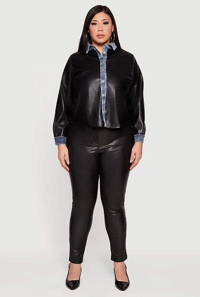 Womens Plus Size Denim Trim Faux Leather Shirt, Black, Size 2X