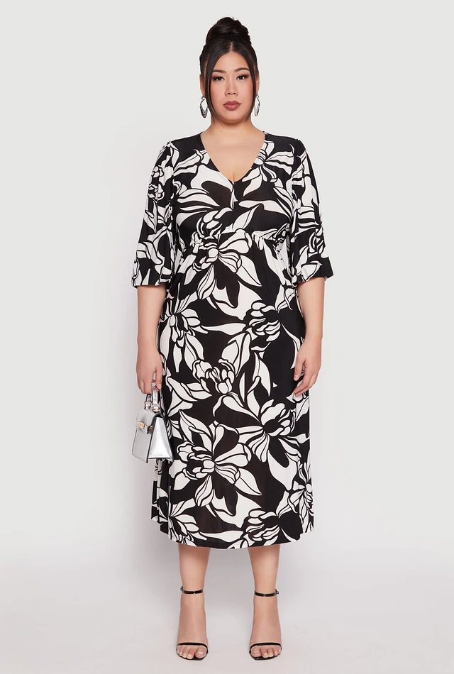 Womens Plus Size Floral V Neck Midi Dress, Multi, Size 1X