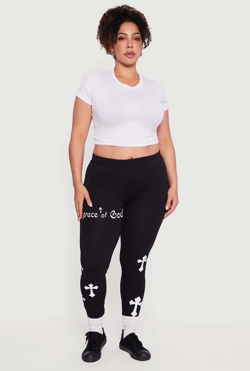 Step into comfort and confidence with these plus size grace of god cross print leggings. Designed to hug your curves with a high-waisted, skinny-leg fit, these leggings bring a bold, faith-inspired graphic to your casual wardrobe. Perfect for lounging, running errands, or pairing with your favorite oversized tee for effortless style. High-waisted design for a flattering silhouette skinny-leg cut that fits snugly from waist to ankle bold "grace of god" cross print adds a unique statement comfortable tight fit ideal for casual, everyday wear ankle-length perfect for pairing with sneakers or boots model pictured wearing size 1xheight 5 ft 8 in, bust 36 in, waist 35 in, hips 47 infits true to sizemeasurementsinseam: 30 incontent and care material: 95% cotton, 5% spandex care instructions: machine wash, tumble dry country of origin: bangladesh rainbow item number 3969033873983