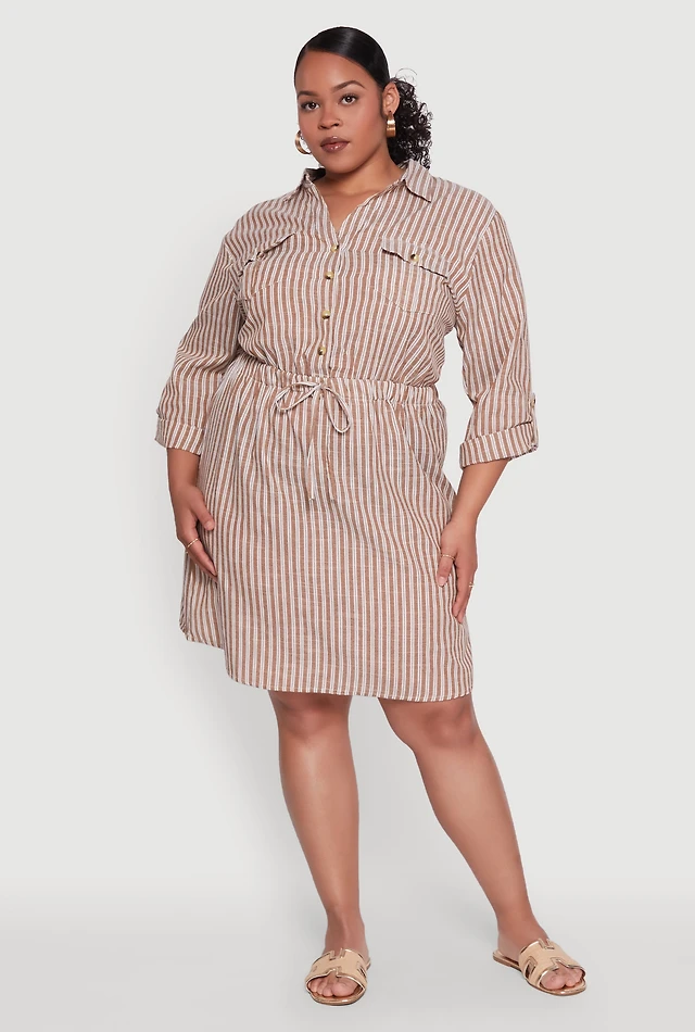 Plus Half Button Striped Shirt Dress