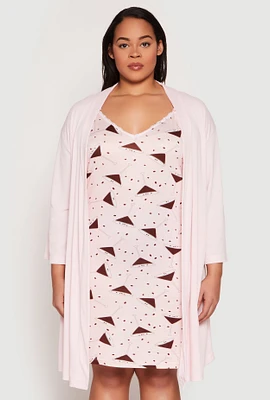Womens Plus Size Graphic Print Lace Trim Nightgown and Robe, Pink, Size 1X