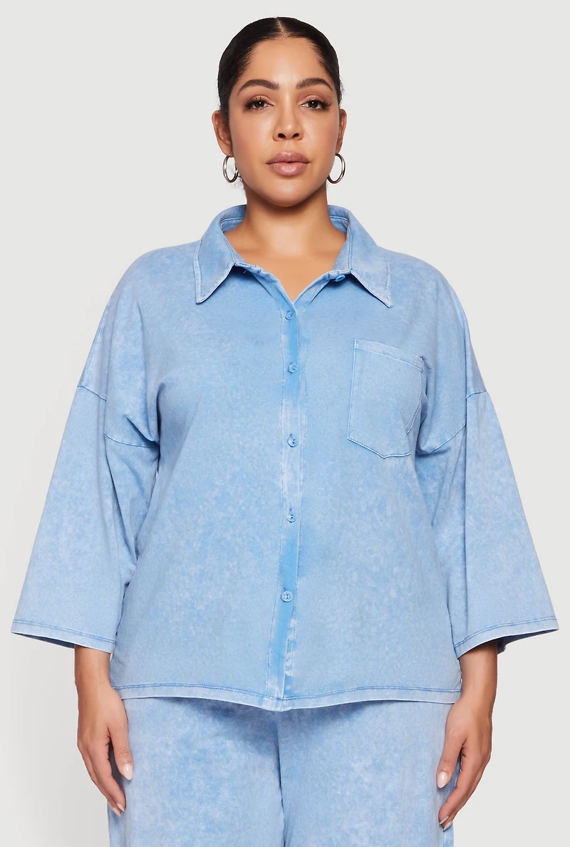 Step into effortless cool with this plus size oversized acid wash button front shirt. Designed for a relaxed fit and easy silhouette, it combines vintage vibes with modern comfort. The acid wash pattern adds a trendy edge while the 3/4 sleeves and drop shoulder design keep it casual and breezy. Perfect for layering or rocking solo, this shirt brings laid-back style to your everyday wardrobe. Relaxed fit with an easy silhouette for all-day comfort trendy acid wash pattern for a retro-inspired look 3/4 length relaxed wide sleeves for a casual vibe classic shirt collar with button front closure drop shoulder design enhances the oversized feel model pictured wearing size 1xheight 5 ft 8 in, bust 36 in, waist 35 in, hips 47 infits true to sizecontent and care material: 95% cotton, 5% spandex care instructions: machine wash, tumble dry country of origin: egypt rainbow item number 3850062700710 blue - 3850062700710340