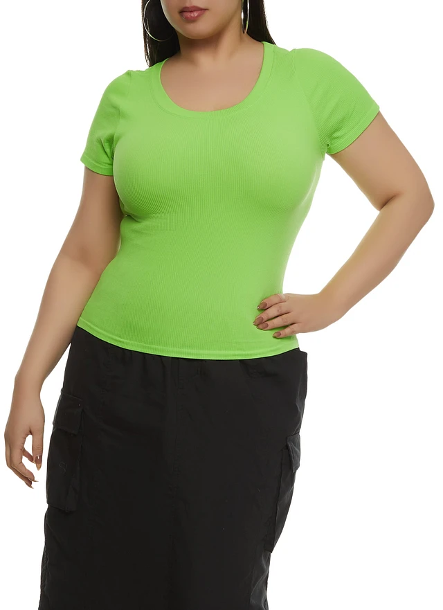Womens Plus Size Ribbed Crew Neck T Shirt, Green, Size 2X-3X