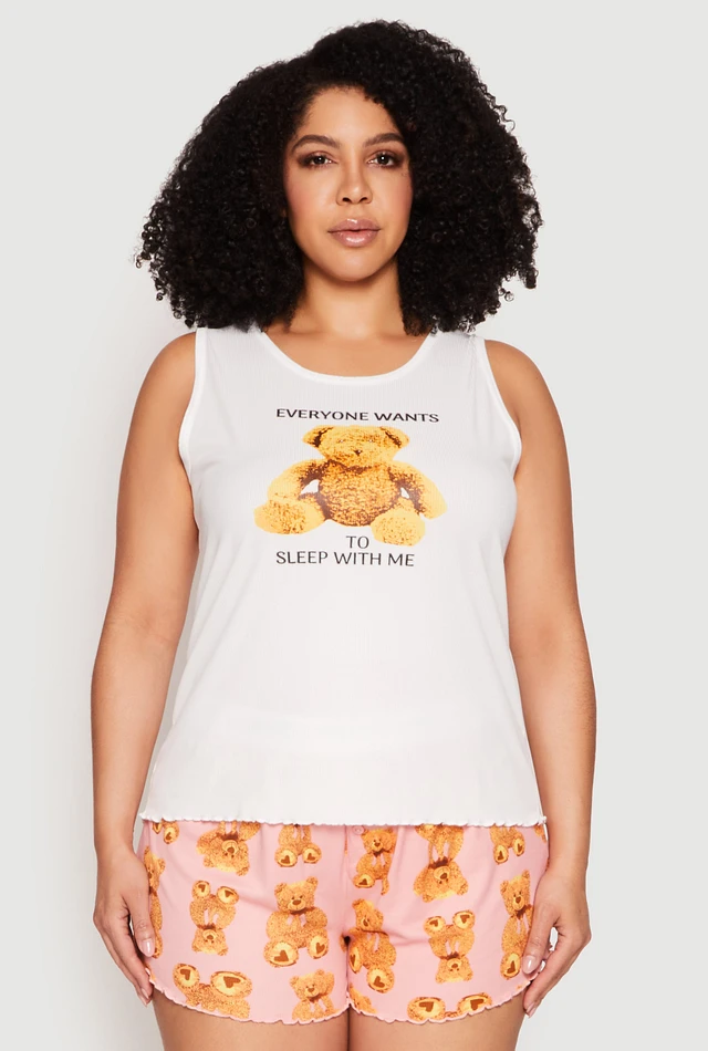 Womens Plus Teddy Bear Graphic Pajama Tank Top and Shorts, Multi,