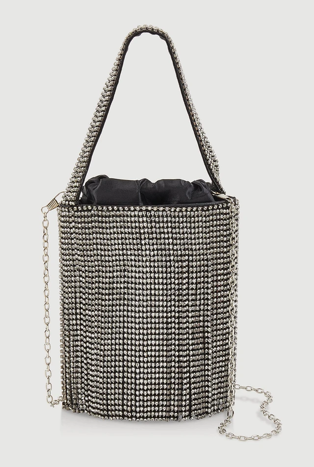 Womens Rhinestone Fringe Crossbody Bucket Bag, Black