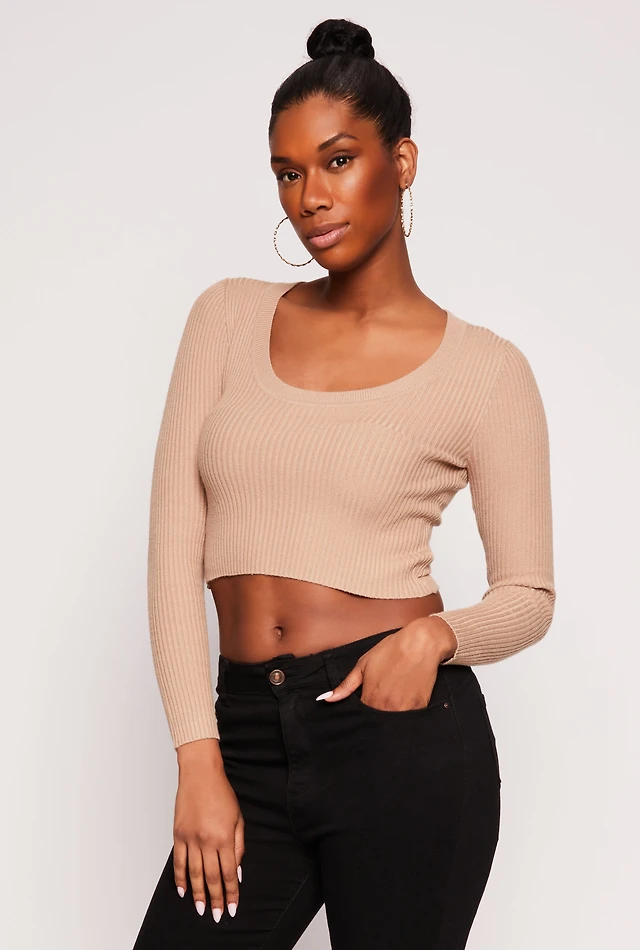Rib Knit Scoop Neck Long Sleeve Crop Top