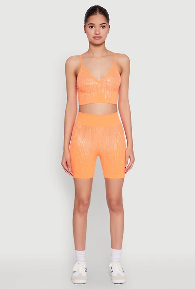 Womens Seamless Rhinestone Ribbed Biker Shorts, Orange, Size S-M