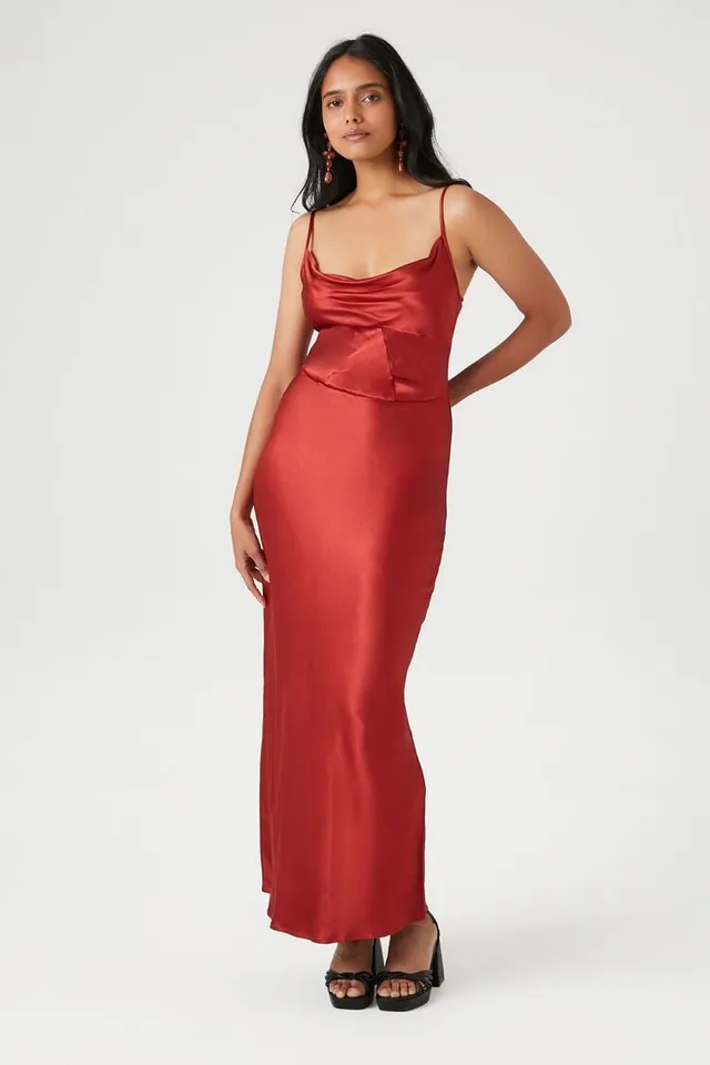 Women's Satin Lace-Up Maxi Dress in Brick Small