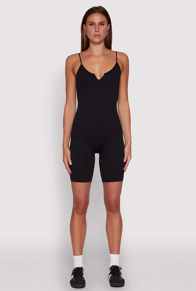 Womens Seamless Rib Knit Notch Neck Biker Romper, Black, Size S-M
