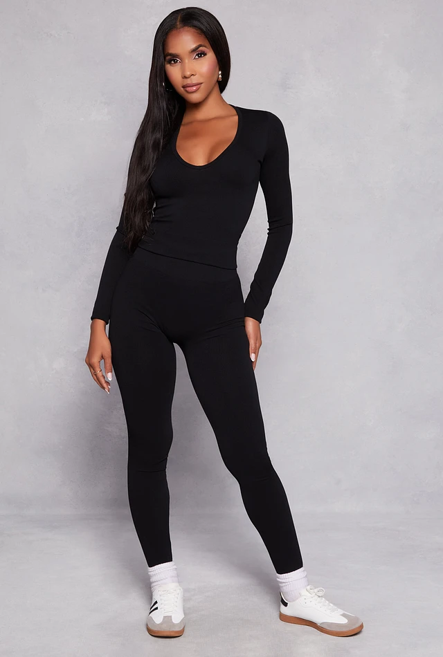 Womens Seamless Ribbed Knit Long Sleeve Top and Leggings Set, Black, Size M