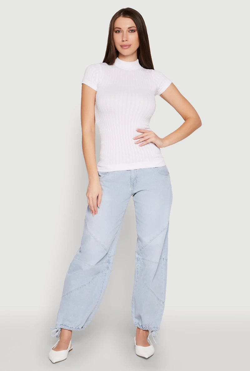 Discover effortless style with our seamless short sleeve mock neck top. Designed for those who want to stay chic without sacrificing comfort, this classic piece is a wardrobe staple that elevates your everyday look. Its timeless silhouette and textured knit fabric make it perfect for mixing and matching with your favorite jeans, skirts, or shorts. Whether you're heading out for a casual day or a quick coffee run, this top has got you covered in style and comfort. Seamless textured knit fabric for a smooth, comfortable fit classic fit with a timeless silhouette that flatters all body types mock neck design adds a touch of sophistication to any casual look perfect for pairing with jeans, skirts, or shorts for versatile styling short sleeves keep you cool and comfortable all day long affordable and trendy, ideal for everyday wear or layering model pictured wearing size sheight 5 ft 9 in, bust 34 in, waist 27 in, hips 38 infits true to sizecontent and care material: 60% cotton, 35% polyester, 5% spandex care instructions: machine wash, lay flat to dry country of origin: china rainbow item number 1305038345013