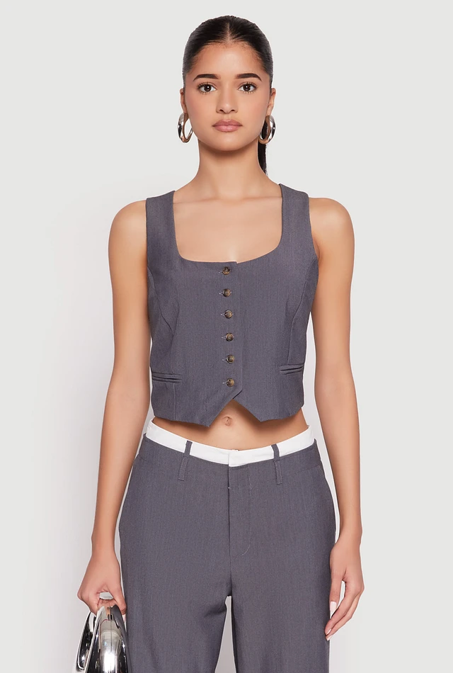 Womens Square Neck Button Front Cropped Blazer Vest, Grey, Size S