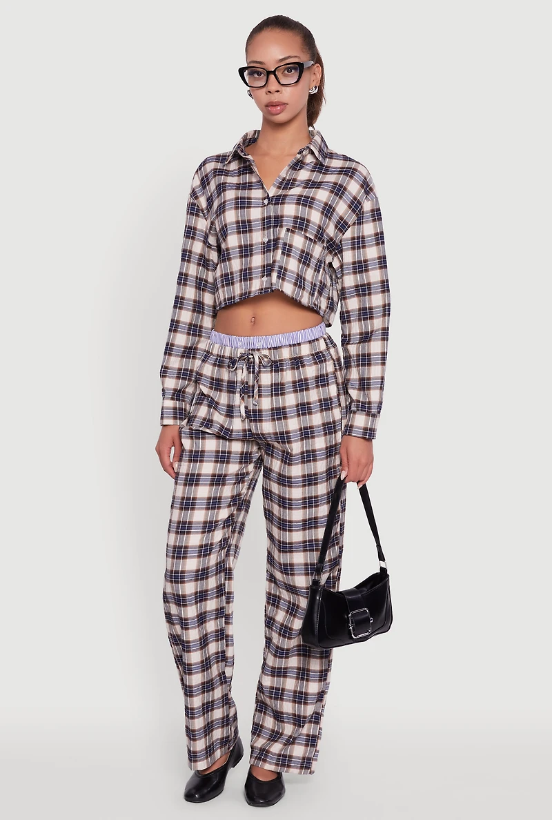 Step up your casual game with these striped waistband detail plaid pants. Designed for effortless style and comfort, they feature a classic straight-leg cut and a flattering mid rise that fits just right. Whether you're lounging at home or out and about, these pants bring a playful twist to your everyday look with their unique striped waistband detail. Easy to pair and impossible to ignore, they are your new go-to for laid-back vibes with a dash of cool. Classic fit with a mid rise for a comfortable, flattering silhouette full-length straight-leg design that pairs perfectly with sneakers or flats unique striped waistband detail adds a fun, stylish edge casual loungewear style ideal for relaxed days or casual outings versatile plaid pattern that works with a variety of tops and layers model pictured wearing size sheight 5 ft 10 in, bust 32 in, waist 22 in, hips 36 infits true to sizemeasurementsinseam: 30 incontent and care material: shell 1: 54% cotton, 45% polyester, 1% spandex, shell 2: 100% cotton care instructions: machine wash, tumble dry country of origin: china rainbow item number 3099077660160 ivory multi - 3099077660160011