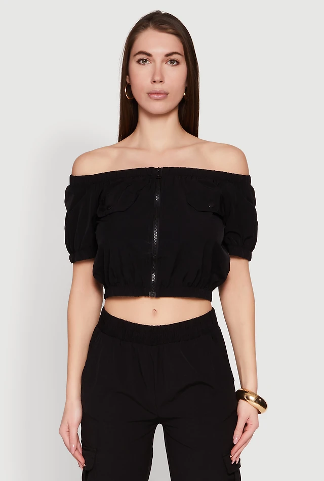 Womens Zip Front Bubble Sleeve Crop Top, Black, Size S