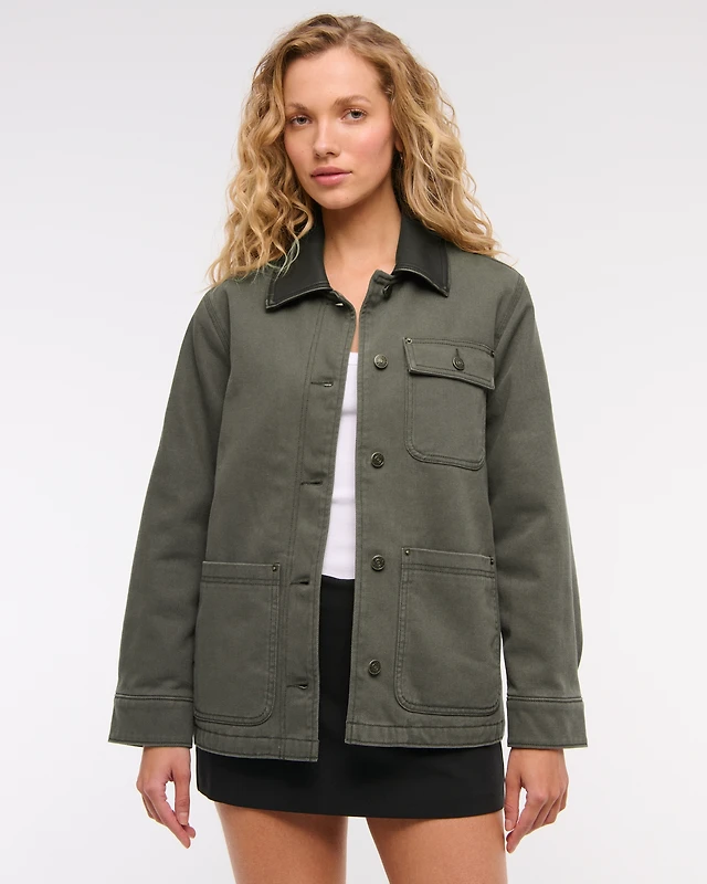 Sherpa-Lined Cropped Twill Workwear Jacket