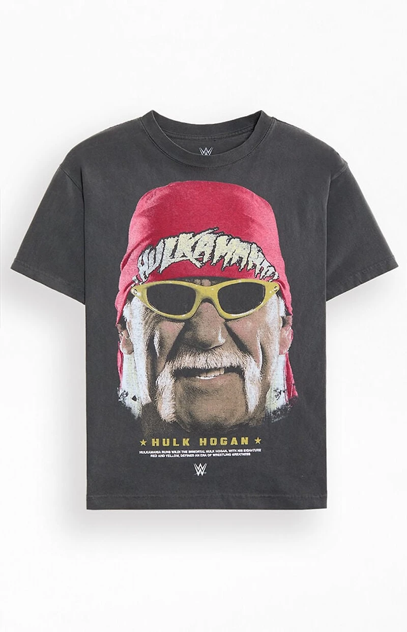 The WWE Hulkamania T-Shirt throws it back with heavyweight legend energy and a vintage feel. It’s built with short sleeves, a crew neckline, washed black fabric for that worn-in look, and a bold Hulk Hogan graphic on the front and back.