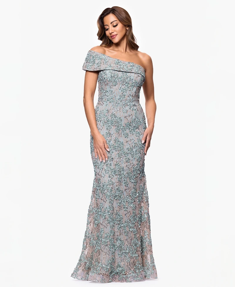 Radiate sophistication in this long, sculpted gown from Xscape. A one-shoulder style and ruffled details offer a striking silhouette for formal occasions.