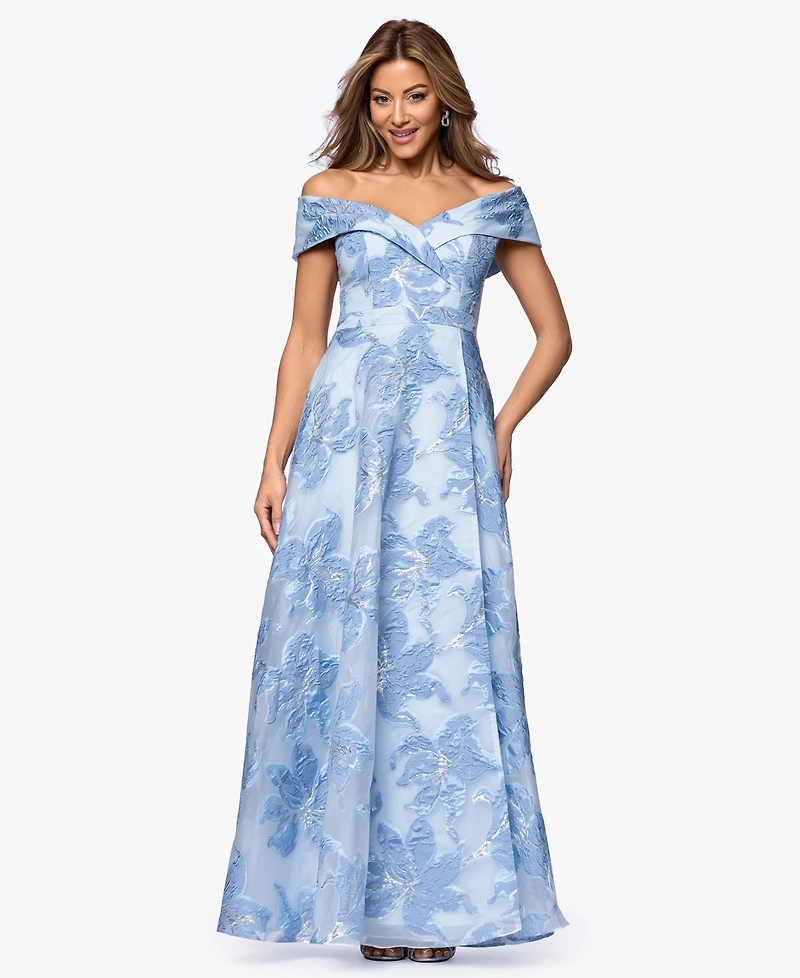 Xscape Women's Long Jacquard Printed Off-The-Shoulder Ball Gown