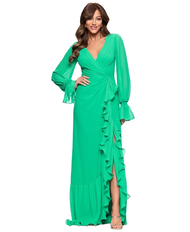 Xscape Women's V-Neck Ruffle-Trim Slit-Front Chiffon Gown
