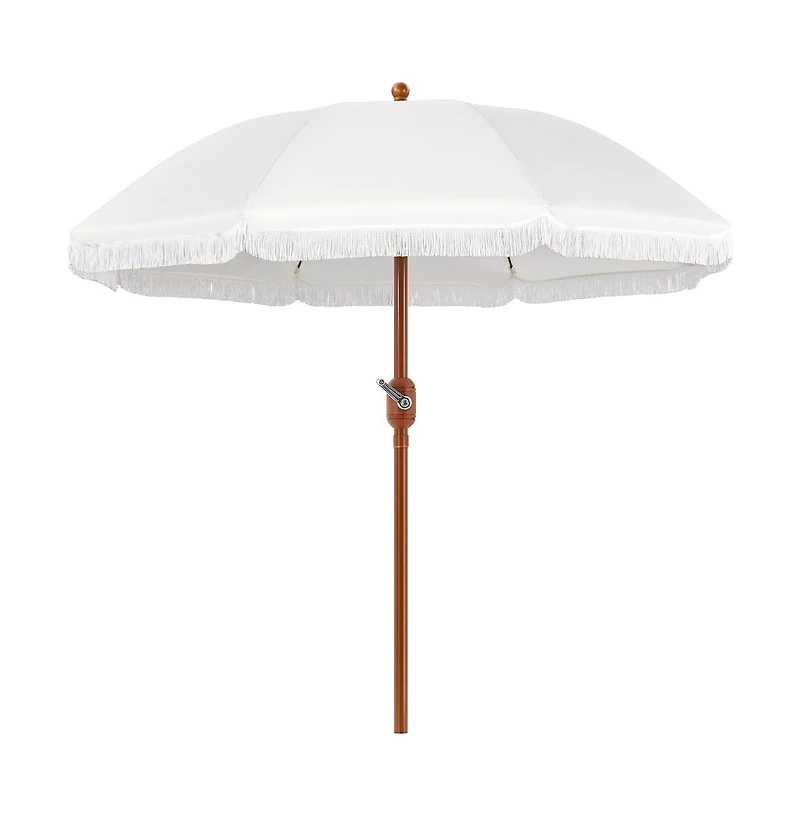 Bring a romantic breeze to your outdoor setting with this 7.5ft French-style umbrella. Featuring a round dome, elegant pinstripes, and flowing braided tassels, it offers flexible shade with crank-and-tilt ease. Durable fiberglass ribs and a sturdy pole provide lasting support for charming afternoons on patios, gardens, or cafe terraces.