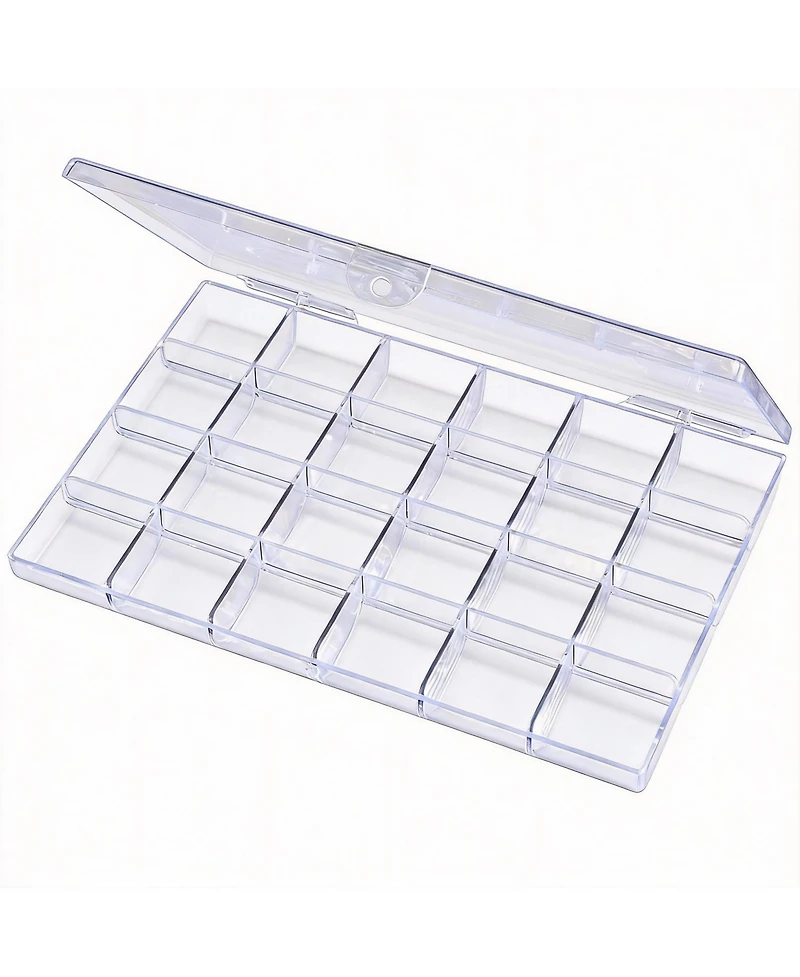Compact clear organizer, 7 x 4.76 in, 24 separate cells keep beads, findings, nuts, bolts, pins and tiny jewelry tidy and easy to spot. Smooth, waterproof plastic wipes clean in seconds, protects pieces from dust and moisture, and slips into nightstand or drawer. Store rings, earrings, necklaces, cufflinks or brooches at a glance and start every morning fast. weight: 0.57 pounds. Length: 8.74 inch. Width: 5.63 inch. Height: 1.61 inch.