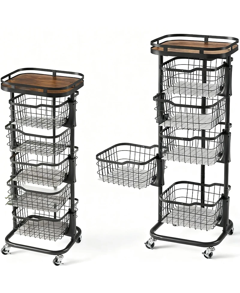 5-tier rotating storage cart with removable wire baskets for easy access and cleaning. Each 5.7-inch-deep basket holds produce, snacks, or pantry items. Smooth 360° spin even when full.Ventilated bins keep contents fresh. Four swivel wheels, two lock, roll then park in tight corners. Magnetic latches stop accidental spills. Tool-free assembly, labeled parts, manual and video guide included. weight:0.15 pounds. Length:12.20 inch. Width:13.50 inch. Height:37.80 inch.