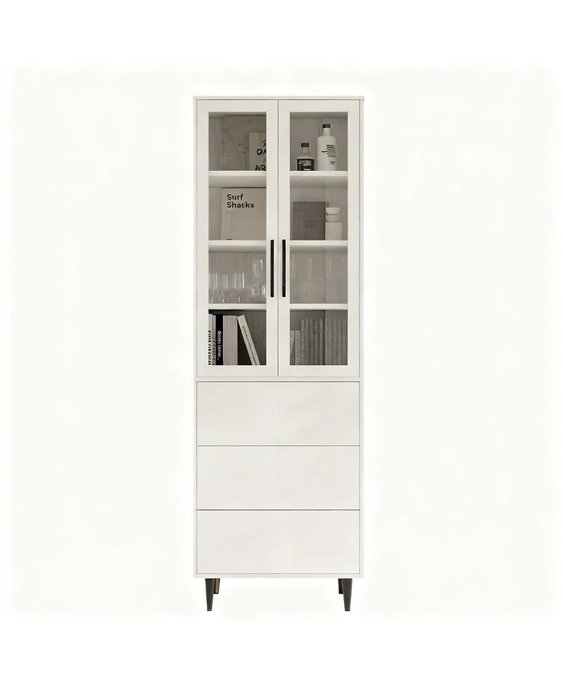 Stylish Storage: Ideal for your home office, living room, or bedroom. This sleek cabinet beautifully displays books, collectibles while keeping them dust-free. Its narrow design fits perfectly in tight spaces. Standing tall with a compact width, this cabinet offers generous storage with fixed shelves. The elevated base is robot-vacuum friendly, making cleaning easy. Features elegant tempered glass doors to showcase items beautifully, smooth push-to-open wooden doors that offer concealed storage with a modern touch. Both options provide secure, dust-free protection for your belongings.This sturdy cabinet features 20 lb weight capacity shelves for heavy books and decor. The elevated base not only adds modern flair but lets your robot vacuum glide underneath for truly hassle-free cleaning. Easy Assembly and Support: Includes pre-drilled holes, numbered parts, and clear instructions for hassle-free assembly.Weight: 0.15 pounds. Length: 15.70 inch. Width: 23.60 inch. Height: 70.90 inch.