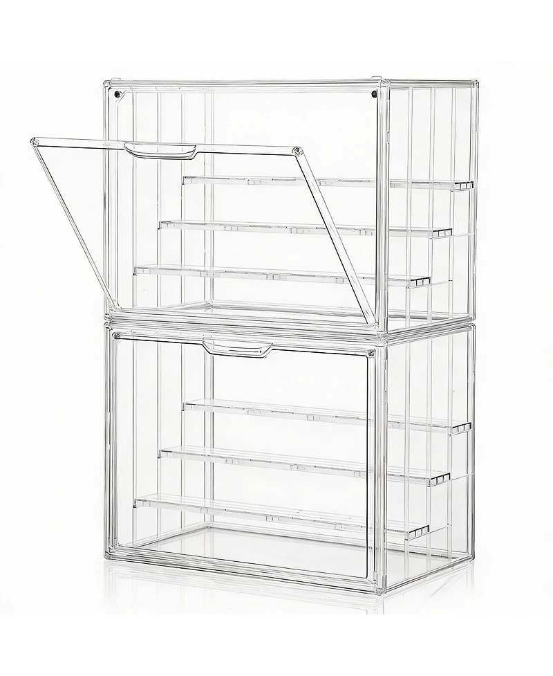 Clear acrylic display box lets every item shine. Three movable shelves snap out or shift up and down to fit dolls, books, makeup, Lego or spices. Units lock together for stable stacking and the magnetic front door keeps dust out while opening with one hand. Tool-free assembly in minutes.