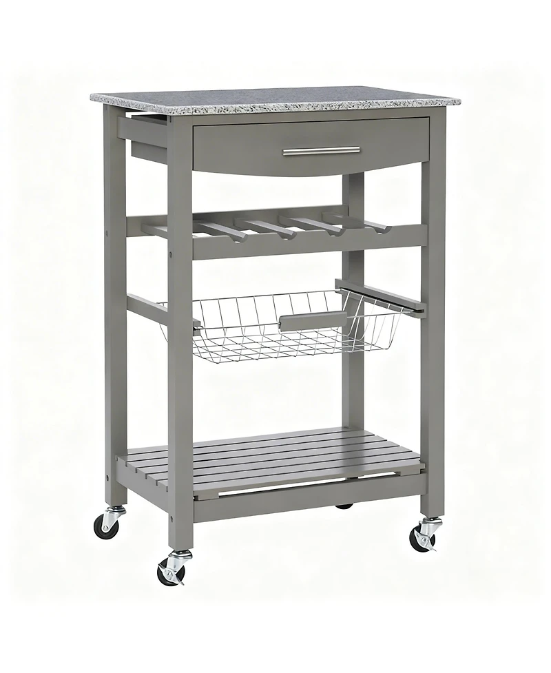 Made of pine wood, granite and casters in warm gray with silver hardware. The gray-white granite top is food-safe and wipes clean. A front drawer, four-bottle wine rack, wire produce basket and lower shelf keep items handy. Smooth casters lock for stability. Use it for prep, storage or serving anywhere. Solid wood frame. Weight: 0.41 pounds. Length: 15.75 inch. Width: 22.88 inch. Height: 33.88 inch.