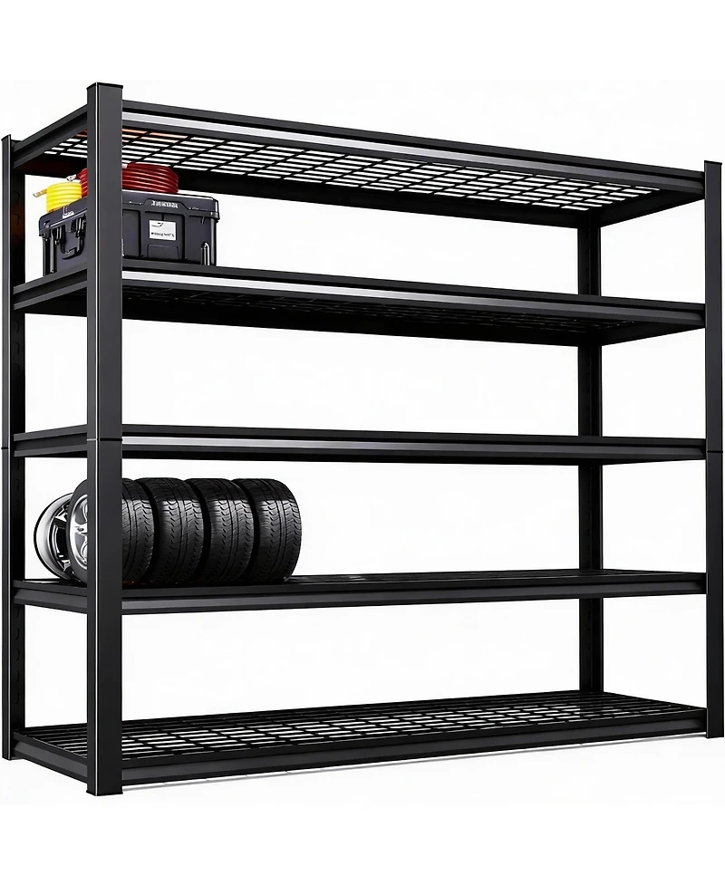 Heavy-Duty Steel Garage Shelving for Us homes: thickened frame and reinforced shelves hold 400 lb per level no sag, warp, or bend. Anti-slip feet plus included wall anchor keep the unit steady on any floor, kid- and pet-safe. Tool-free assembly in under 10 min with clear manual. Five adjustable tiers store kitchen goods, tools, books, or bins industrial look fits pantry, garage, basement, or living room. Weight: 0.11 pounds. Length: 45.60 inch. Width: 78.00 inch. Height: 2.63 inch.
