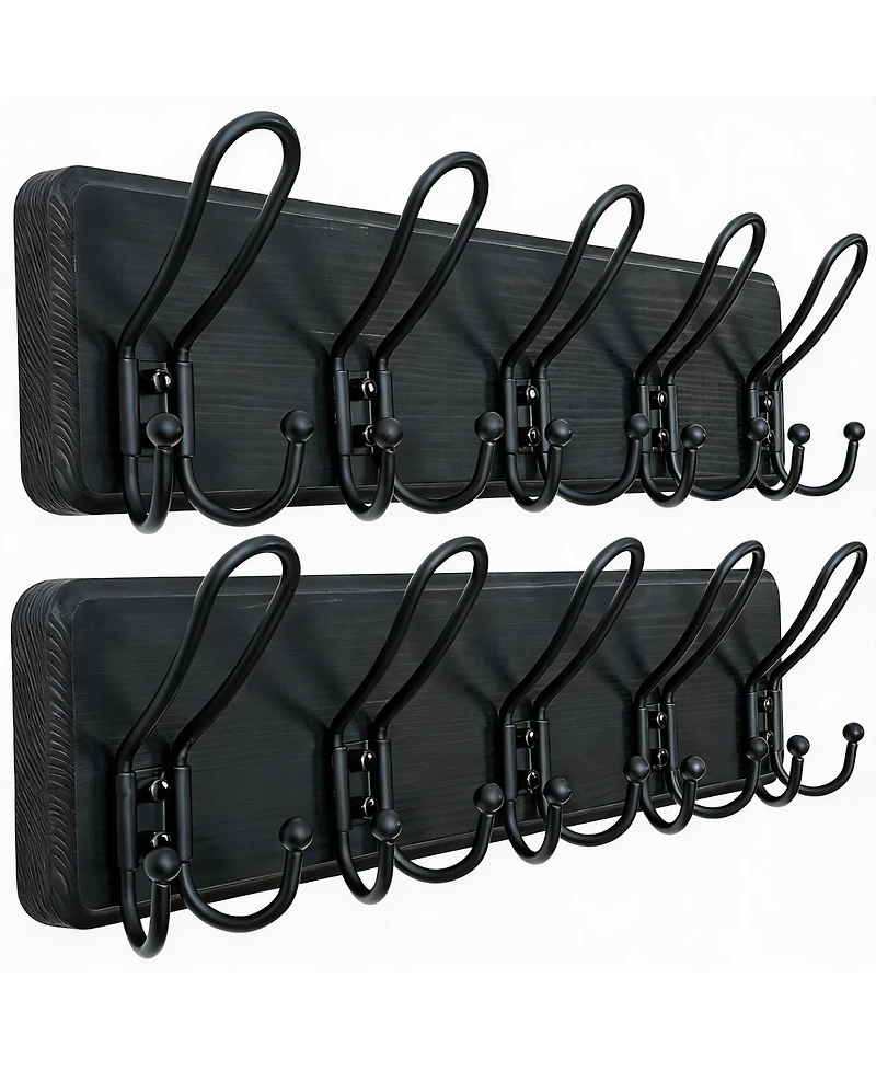 Heavy-duty wall coat rack with five metal wire hooks and solid pine back for lasting strength. Rustic black finish adds farmhouse warmth. Arrives ready to hang mounts on 16-inch studs with included hardware. Each rail shows natural wood grain chosen by hand. Set of two, 17.25 x 4.88 x 3 inches, pine and metal. Length: 17.76 inch. Width: 5.20 inch. Height: 5.12 inch. Weight: 2.25 pounds.