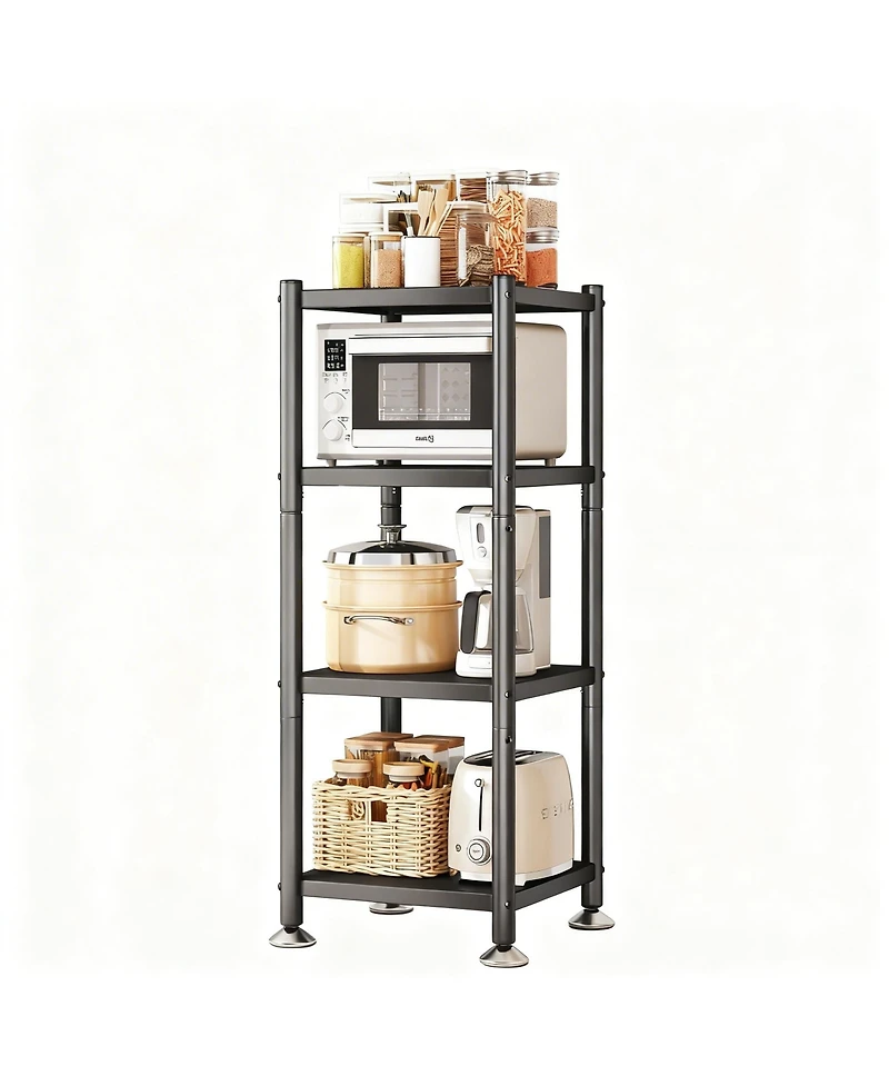 Multipurpose 4-tier metal shelf fits kitchen, bath, garage or bedroom corners to keep spaces tidy. Carbon-steel frame holds 450 lb black finish resists rust and stains. Shelves adjust in 3.15-inch steps four casters (two lock) plus four foot pads for stable rolling or fixed use. Tool-free assembly in minutes. weight: 0.01 pounds. Length: 12.40 inch. Width: 17.00 inch. Height: 45.30 inch.