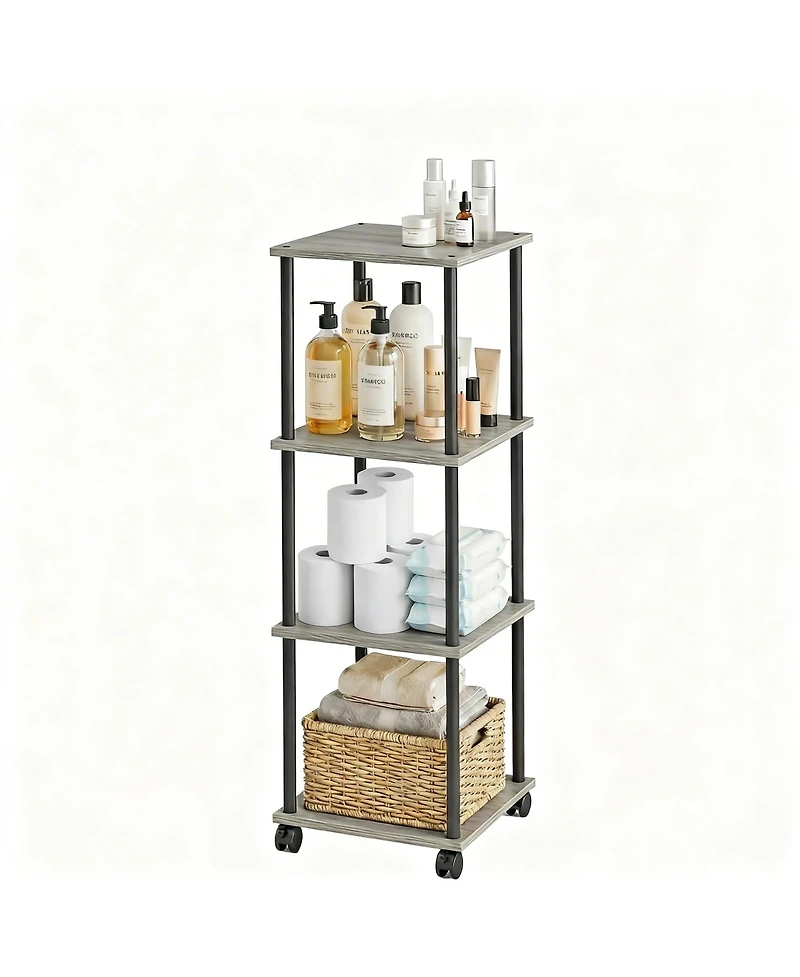 Easy mobility with four smooth wheels, two lock for steady placement. Four open shelves store towels, toiletries or kitchen items. Slim frame tucks beside toilet, tub or corner to save space. Sturdy metal frame with wipe-clean finish. Works in bathroom, kitchen, laundry or living room. Weight: 0.14 pounds. Length: 11.80 inch. Width: 11.80 inch. Height: 38.20 inch.