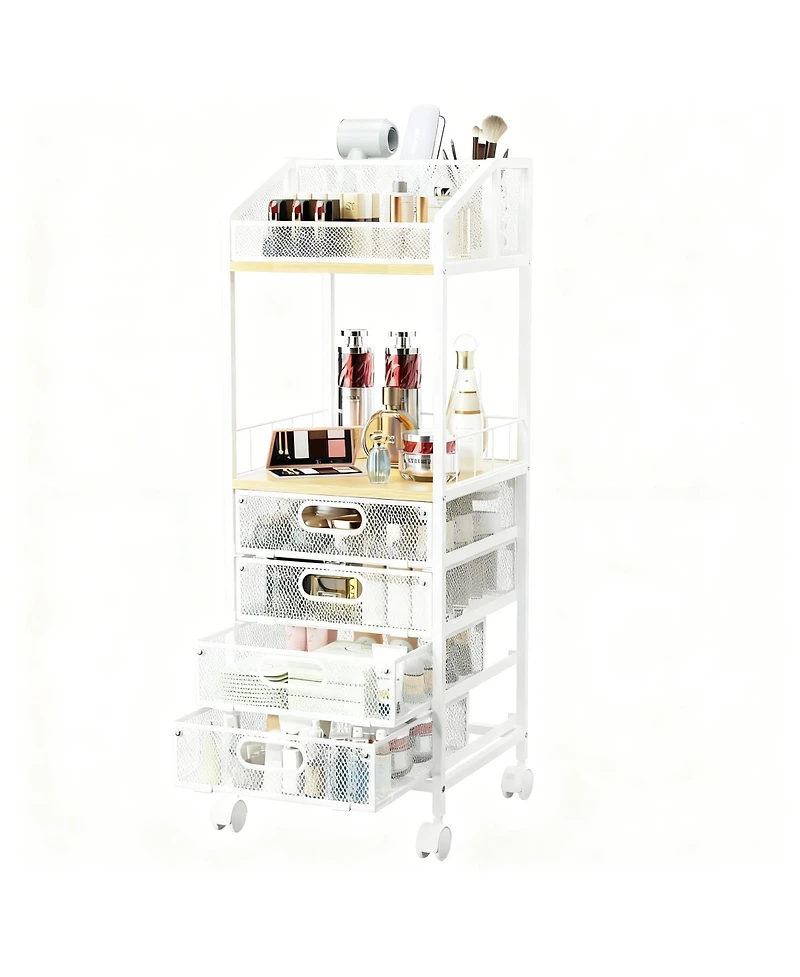 Large-capacity makeup organizer with six sections: top tray with four removable dividers for brushes, dryer, straightener, daily lipstick and perfume open middle shelf for full-size cleanser, toner, lotion, remover four see-through mesh drawers for creams, masks, pads, palettes, jewelry and accessories. Four 360° wheels, two with locks, switch to included foot pads for stationary use.Weight: 0.15 pounds. Length: 11.61 inch. Width: 13.00 inch. Height: 34.00 inch.