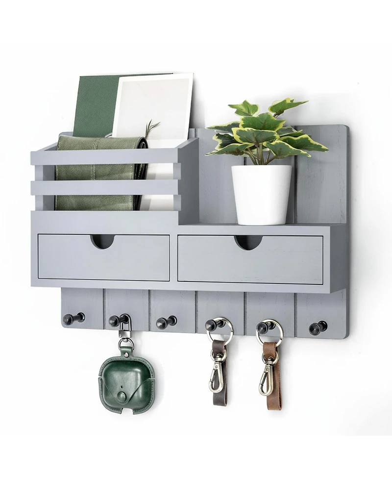 Yigii Wall Mounted Key Holder with 2 Drawers 6 Hooks Shelf Mail Organizer Decor