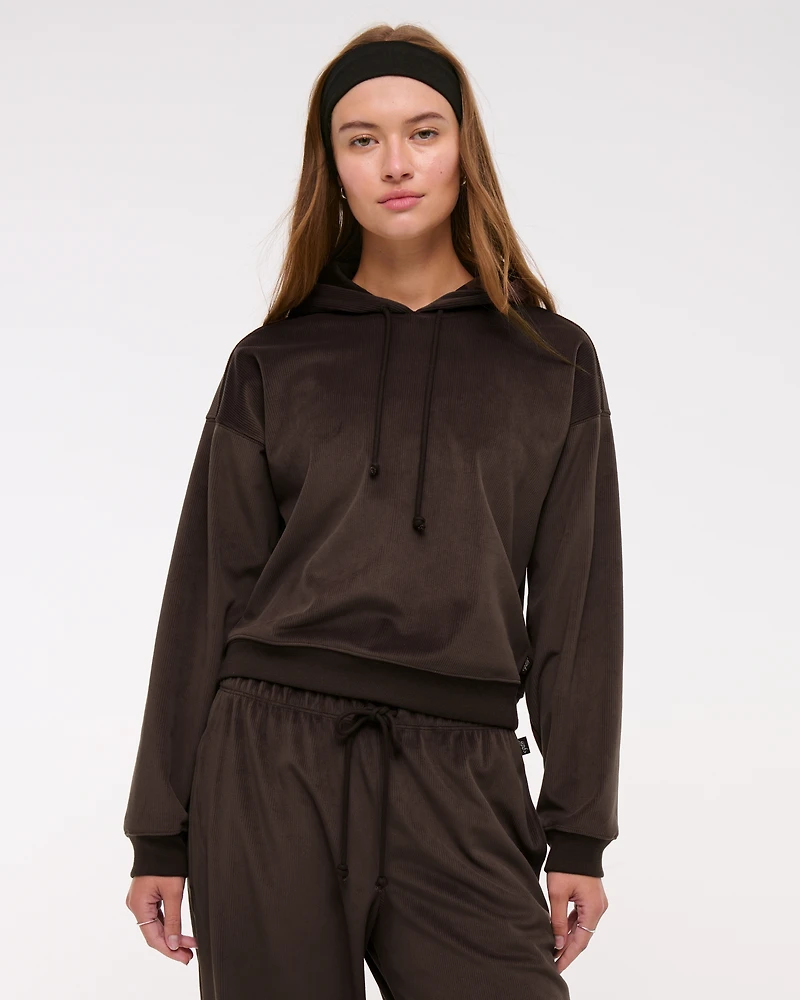Our new active popover hoodie in our active superSOFT rib fabric and core length. Our superSOFT rib fabric is ribbed and velvety on the outside for a cozy feel with a cooling, smooth interior lining that keeps you comfortable. Features a relaxed-fit silhouette, exterior drawcords, all-over ribbed detail and banded hem and cuffs. Pairs perfect thrown over your favorite YPB sports bra or slim tank!