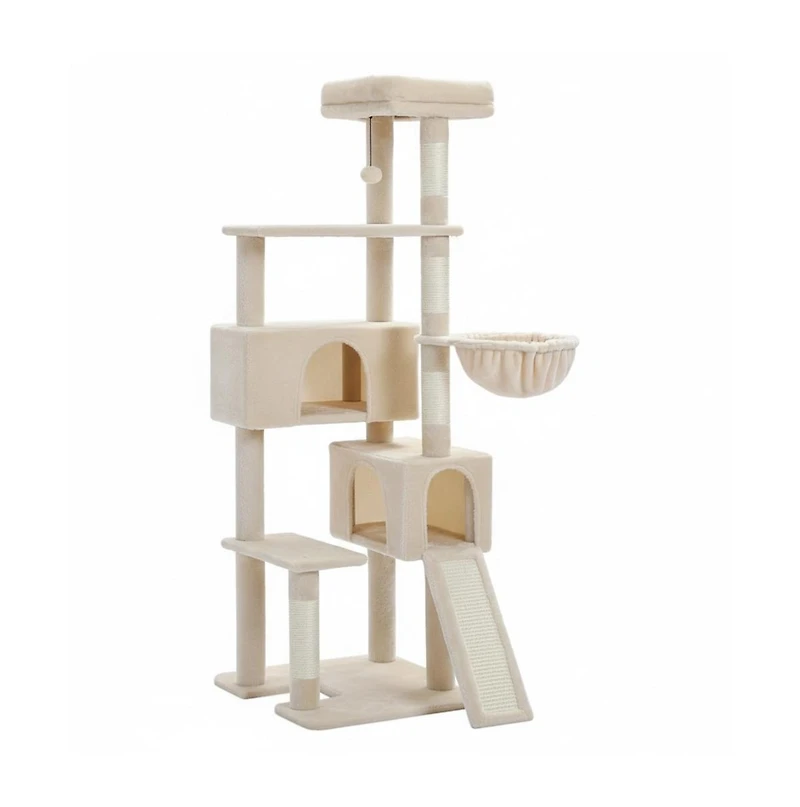 This 65-inch beige cat tree tower (62.01x19.69x19.69in, 36.80lbs package: 20.66x12.20x20.07in, 39.68lbs) is a large multi-functional activity hub for multi-cat families, featuring a 5-layer design and 3 top platforms. It comes with hammocks, baskets, cat beds, a viewing platform with wooden stakes, hanging balls, ladders, and scratch columns—meeting cats climbing, playing, jumping, and resting needs. Built with a solid bottom and wall support design, it supports up to 33 lbs for stable, anti-tipping use, and is wrapped in soft long plush for comfort and safety. Boasting a modern simple style, it doubles as home decoration for living rooms, bedrooms, or balconies. Assembly is easy with a simple structure, detailed manual, and professional customer service support.