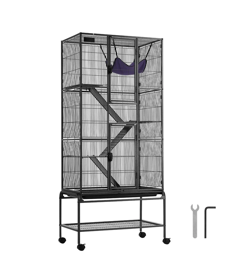 Provide a spacious home for your small pets with this multi-level cage, measuring 29.7"" x 17.9"" x 69.1"". The four-tier design features four height platforms, three slip-proof ramps, and a top hammock, offering plenty of space for exercise and entertainment for multiple pets. Reinforced thick metal square tubes with fine powder coating ensure great stability and rust resistance, while narrow 1/2"" wire spacing and screw-in door latches help keep pets secure. Removable platforms and grids simplify cleaning, and the Abs-coated metal bottom tray fits tightly to prevent leakage. A dual-layer door with an openable top window allows for easy feeding and interaction, making this cage suitable for ferrets, chinchillas, guinea pigs, hedgehogs, and small kittens.