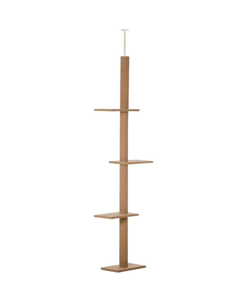 Brown Floor-to-Ceiling Cat Tree, 17"L x10.75"W x89.75"H, sturdy particle board build. Adjustable 89.75"-102.25" height via tension rod for ceiling stability, 4 carpeted jump platforms, sisal-covered scratching posts. Soft paw-friendly surface, ideal for kittens climbing and play.
