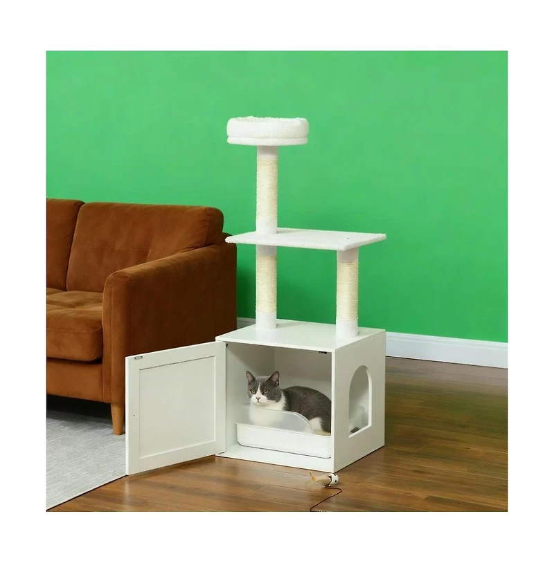 2-in-1 White Cat Tree with Litter Box Enclosure, saves space with hidden litter cabinet (side entry) and 3-tier cat tree. Features 3 sisal scratching posts, plush top bed, fits 2 cats under 22 lbs each. Sturdy Mdf, soft polyester upholstery. Assembly required. Size:19.7"L x17.7"W x49.2"H.
