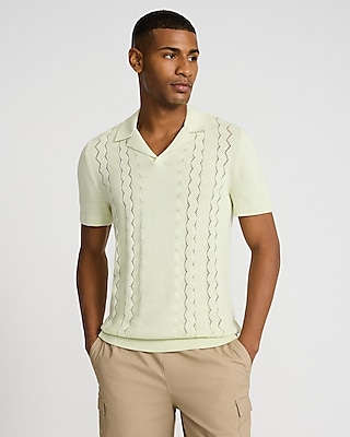 This short sleeve sweater polo is crafted from breathable cotton and features an open knit zig zag pattern and a camp collar.