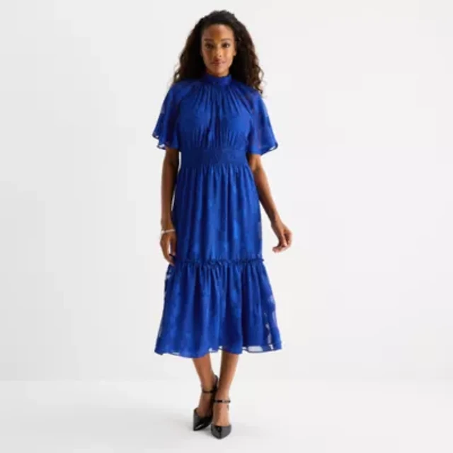 Melonie T Womens Short Sleeve Midi Fit + Flare Dress
