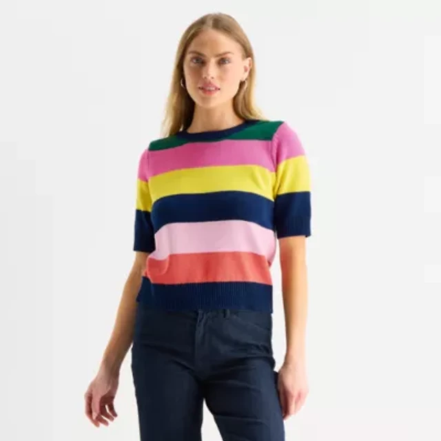 St. John's Bay Womens Crew Neck Short Sleeve Striped Pullover Sweater