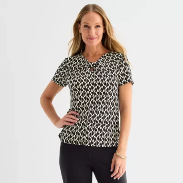 Liz Claiborne Womens Split Tie Neck Short Sleeve Blouse